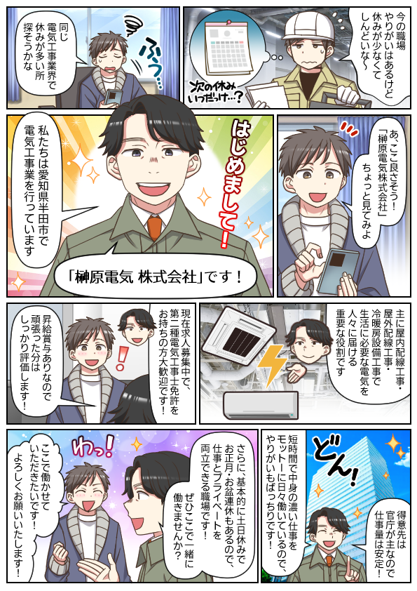 | 応募資格 | 【必須】第二種電気工事士、普通自動車運転免許 【歓迎】第一種電気工事士、施工管理技術者 |